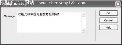 用行为丰富网页效果 弹出消息框 如果希望别人进入网站首页的时候可以看见一个弹出的消息框来显示一些内容,则可以通过下述方法实现。 第一步 在Dreamweaver MX 2004主窗口中新建一个页面,接着运行“Windows→Behaviors”命令激活行为面板。 第二步 在行为面板中点击“+”按钮,并且从弹出菜单中选取“Popup Message”命令,这时可以看见图1所示的窗口,在其中可以输入诸如“欢迎光临中国电脑教育报网站!”之类的提示信息。