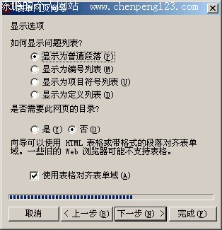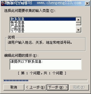 网上的信息反馈,其实就是交互表单,通常表单主要用于信息调查、收集统计数字等方面,在电子商务流行的今天,表单的作用更是不容忽视,我们可以利用表单来轻松完成各种数据的收集、获得用户定单等,对于不懂数据库的我们,还是先学学FP的简单表单制作方法吧,也免的落伍与这个电子商务时代。 首先打开"文件"菜单,选择"新建",在子菜单中选择"网页"命令。在弹出的对话框中点击"常规"选项卡,然后选择"表单网页向导",并单击"确定"按钮。 弹表单制作向导对话框后,单击下一步按钮,当我们第一次使用表单网页向导的时候,需要单击"添加"按钮,来添加问题。弹出如图001的对话框后,我们可以在"选择此问题要收集的输入类型"列表框中选择要添加的类型。