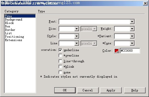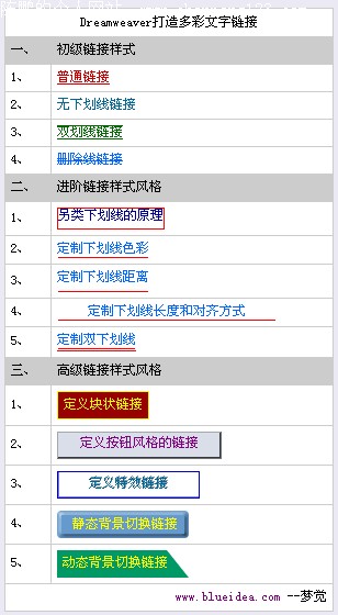 文字链接可以说是网页中最常见的页面元素了,默认的文字链接样式都是带下划线的效果,这种一陈不变的外观可能使很多朋友都想改变它,以使之符合页面的整体效果,自从样式表得到广泛的应用后,这个愿望现在可以非常方便的实现。今天我给大家介绍利用样式表打造多彩的文字链接效果。我将分为初级篇、进阶篇和高级篇给大家作介绍,所有的链接样式效果我们都将在Dreamweaver的样式编辑器中完成,关于Dreamweaver中的样式编辑器的用法请参考以前的介绍。链接样式浏览效果如下图。
