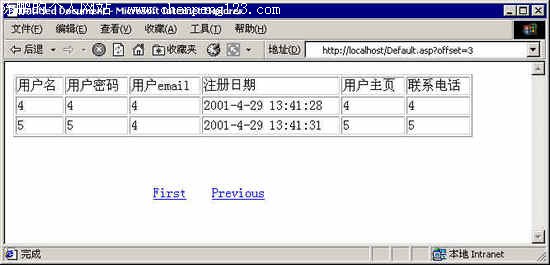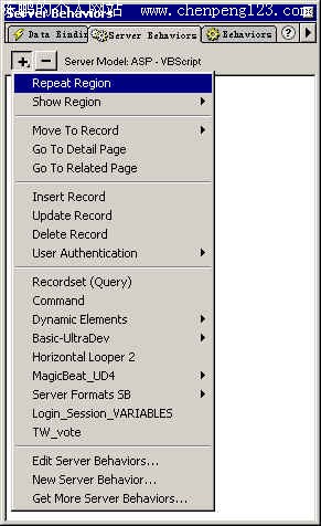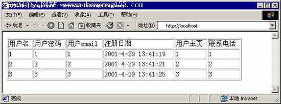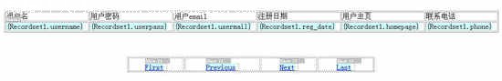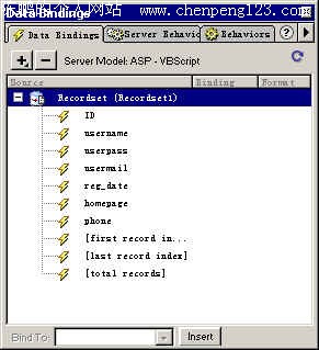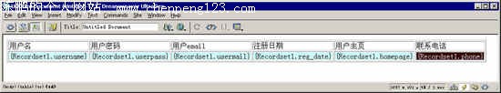 第三章:应用数据库创建动态网页 第三节:显示数据库记录 终于到了显示Dreamweaver Ultradev威力的时候了,先让我们来看看怎么用Ultradev来实现数据的显示功能。很简单的,跟着我来吧。 上一回我们创建好了数据集后,在Data Bindings面板中就有如下的显示: