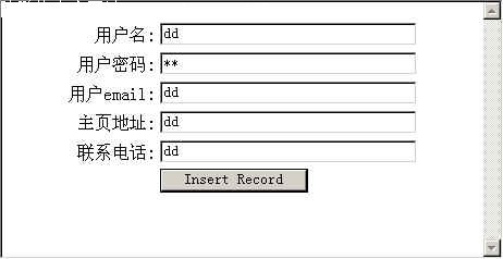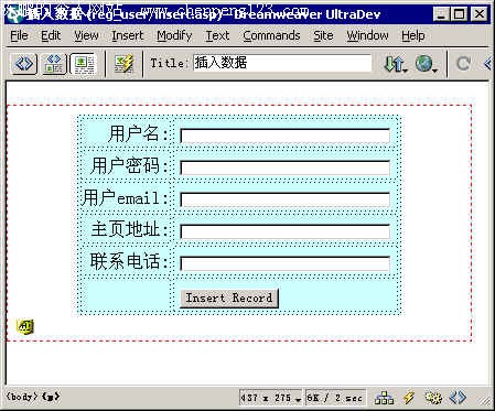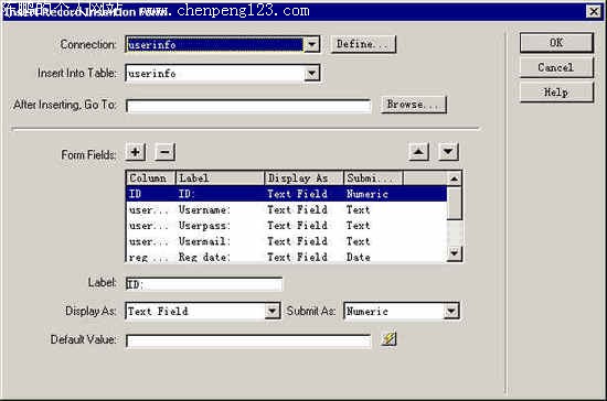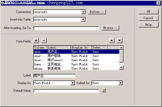 connection是我们已经在站点中已经定义好的数据库连接,选中后,在Insert Into Table一栏中就会出现你所连接的数据库中的表,从中再选择你要插入数据的表。我们的数据库只有一个userinfo表,选中他。接着在下面的Form Fields中就会出现我们在表设计中设计好的字段及其相关属性,Column表示数据库表中的字段名,Display As表示用何种类型的表单域,比如文本表单域(Text Field)来提交我们的纪录,Submit As表示作为何种数据类型来提交,比如数据类型为整数性的字段我们就不能用文本数据类型进行提交。一般这一栏Ultradev会帮我们自动选择的。Label呢则帮助提示你这个表单域填写的内容。After Inserting, Go To一栏是当你提交完数据跳转到那个页面去的意思,比如一般注册成功后都会跳转到一页,告诉你你已经注册成功了,欢迎使用什么什么的,就是这样子的。如果什么都不填的话就表示提交完数据后返回本页面。
