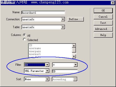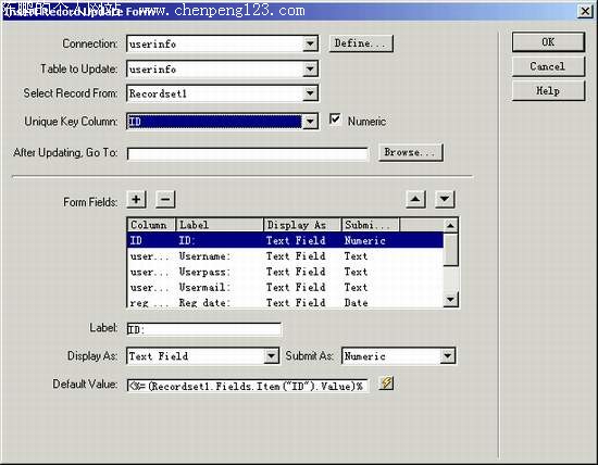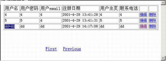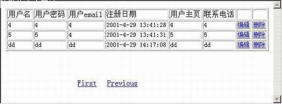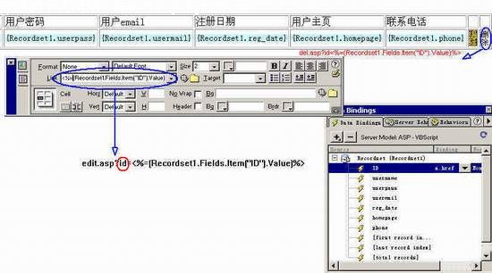 第三章:应用数据库创建动态网页 第五节:编辑数据库中的纪录 要编辑或者删除纪录,首先我们要知道我们正在编辑或者正在删除的是那条记录。张冠李戴的话就不是我们想要的结果了 :) 前面讲数据库设计的时候,特别提到,一个表要有一个主键才能够确定纪录的唯一性,才不会造成删除或者编辑的错误。比如说我们要找一个叫张三的人,但是同时有十几个叫张三的人存在,这样我们就要根据一定的特征来确定哪个张三才是你要找的。主键也是如此,主键可以由一个子段组成,也可以由几个子段组成。对我们这个userinfo表来讲,主键就是名为ID的自动编号字段,这个ID值是唯一的,就是说我们只要知道一个ID就可以唯一的找到一条记录,这样,我们的编辑删除操作就可以正常进行了。 好,唠叨了这么久,就开始我们的旅行吧。 让我们打开我们开始做的那个数据显示的页面来,添加多两个单元格,分别做上编辑和删除的连接,如图。 编辑的连接为: edit.asp?id=<%=(Recordset1.Fields.Item("ID").Value)%> 删除的连接为: del.asp?id=<%(Recordset1.Fields.Item("ID").Value)%> 诸位要问了,这表示什么意思?,让我细细道来。 edit.asp?id=<%=(Recordset1.Fields.Item("ID").Value)%>