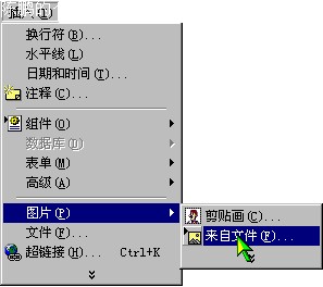 现在可我们看看怎么插入图形 选择“插入”菜单的“图片”命令,单击“来自文件”按钮。