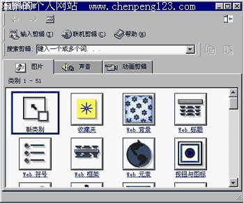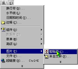 您可能说,我不会画画,插入图片容易,可是编辑图片就不容易了。没关系,FRONTPAGE自己带有许多剪贴画,你可以把它们插入到自己的网页。