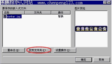 出现了一个对话框, 因为我们刚才插入的文件不在站点内,现在FRONTPAGE要把它复制到站点内,可是使用什么名字,放在站点的哪个目录下呢,就要在这设置了,单击“改变文件夹”按钮,