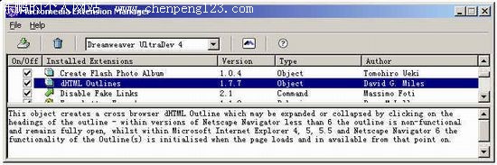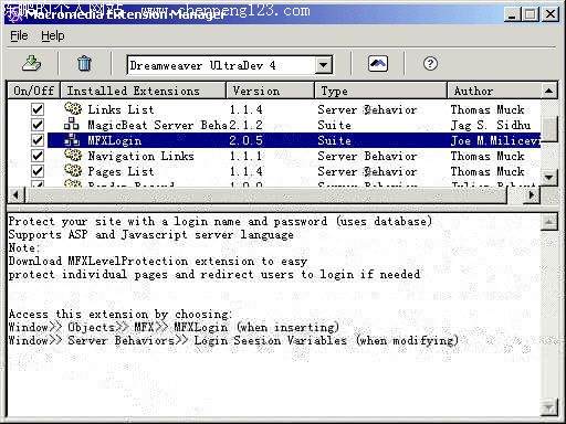 第四章:ultrade插件的安装与简单的使用 使用插件可以帮我们快速的实现一些功能,免去了大量编程的痛苦。以前Dreamweaver和Ultradev的插件是要手工将文件拷贝到相应的目录才能起作用,对于不熟悉这方面的朋友来讲是一件比较麻烦的事情,到了4.0版本的时候Marcomedia使用了一个名叫Extention Manager的工具来帮助用户安装插件,而插件的形式也变为*.mxp了。 Extention Manager是随Dreamweaver或者Ultradev安装的时候就安装上去了,我们可以通过 开始-〉程序 -〉Macromedia Extention Manager 来打开他,显示的界面如下: