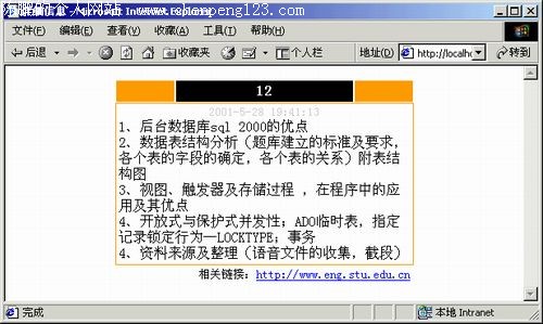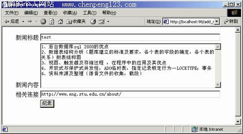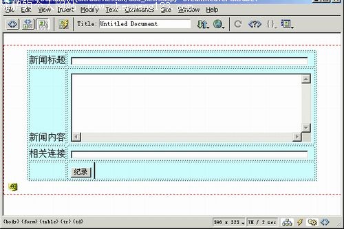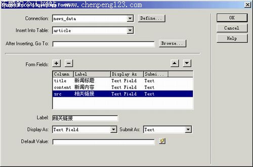 第五章:做一个相对简单的网站后台(2) 后台管理页面可以分为三部分: 数据添加 数据编辑、删除 登陆验证 我们先从数据添加做起。通过前面的学习我们知道,在Ultradev中制作一个数据添加的页是在简单不过的了,只需要 Insert -> Live Objects -> Recordset Insertion Form就行了。如图,是添加新闻的页面,添加管理员用户也类似,就不多讲了:
