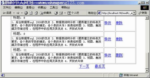第五章:做一个相对简单的网站后台(3) 删除的页面怎么做呢?咦?忘了我们上面讲的吗?用command对象,很简单就完成了: