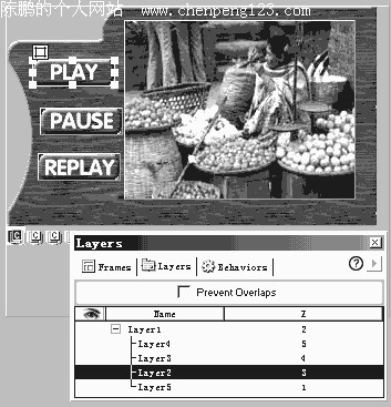 利用Photoshop制作一个金属效果的播放器外观。(具体效果就看你的喜好啦,也许你可从Winamp的skin中受点启发)。作最佳优化后,输出一个透明的GIF图片。为了让鼠标移上后按钮有些变化,你不得不每个按钮制作2张图片(共6个),两个按钮只需有颜色上的差异即可。先建三个层,调整好位置,并插入三个播放键的各自的二张翻滚图片(Rollover Image)(Insert-Rollover Image)。通过调节层的Index-Z的值,确保播放器所在的层在Layer_main层的上面,在按钮所在层的下面。排版好的各层如图所示。