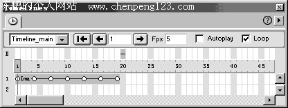 按Ctrl+F9键打开时间链浮动工具面板。选取其中幻灯片所在层(Layer_main)中的初始图片(确保选取的是图像,而不是层),用鼠标拖至时间链浮动工具面板,在时间链起始处释放鼠标。设定帧速率为Fps为5,并勾选Loop框。选择时间链中的其中一帧,右击鼠标,选择"Add Keyframe"(添加关键帧),选择另一幅幻灯片图片,以更换层(Layer_main)中的初始图片。重复这个操作,将剩下的5幅图片全部加到该时间链的不同关键帧上。最后适当调节各关键帧之间的距离。并将该时间链命名为TimeLine_main。建立好的时间链如图所示。