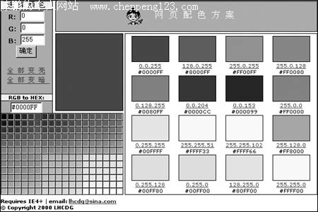 将下载得到的文件解压后,运行其中的“htmlcol.exe”。将鼠标定位到某个你喜欢的颜色上(指向即可,不用点击),在左边的小窗口中就显示出了鼠标所指位置四周的截图。同时,该软件已经将鼠标定位处的颜色抓取下来了。在哪儿?就在右边的五个文本框中。不过,为什么有五个数值呢?呵呵,它们分别代表同一种颜色的五种表现形式。其中网页制作所需要的HTML代码(如“COE3E30”)、颜色名称(如“Blue”,有时为空,毕竟颜色太丰富了嘛);RGB格式(如“126,212,255”)三种形式都有。与其他同类软件相比,它不需要我们手工“抄录”所抓取到的颜色代码,看到每个代码后面的功能键了吗?只要该窗口为当前窗口,按下相应的功能键(“F1”、“F2”等)就可以将此代码复制到剪贴板中,然后打开网页设计软件粘贴颜色代码吧。