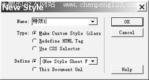 1、在Dreamweaver编辑窗口中,点击菜单命令“Window/Css Styles”打开样式浮动面板,在浮动面板中点击右键菜单中的“New Style”选项或者点击右下角带“+”的按钮,打开新增样式对话框(如图1),在“Name”栏中输入新增特效名称,并选择Type的第一个选项:“Make custom style”,然后点击“OK”按钮,并在出现的保存对话框中输入文件名保存样式文件。