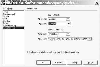 2、在随即出现的样式定义设置对话框中,选择Category列表框中的最后一项“Extensions”选项(如图2),打开扩展窗口参数设置窗口,其中“Page Break”选项用于设置样式应用前后的位置,可以不予设置,而“Visual Effect”下的“Cursor”则用于自定义鼠标指针形状,“Filter”用于选择效果的类型,共有16个选项。用户选择好效果类型以后,将其中有问号的地方改成自己希望的参数,点击“OK”即完成样式的定义。