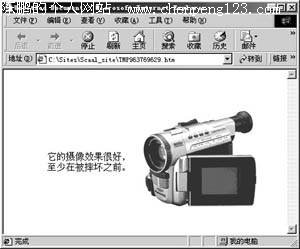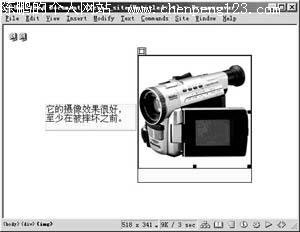 7、至此,你们可以看到,Tracing Image已经成功地辅助我完成了这个简单的布局,当然,Tracing Image完全可以胜任远比这复杂得多的页面布局任务。但我的工作还没有完成,我的设计是要在右边的大的层中放置一台数码摄像机的图片,而在左边的小的层中放置对这台摄像机的说明。分别在大层和小层中插入图片和输入文字后,页面看起来是这样的(见图3)。