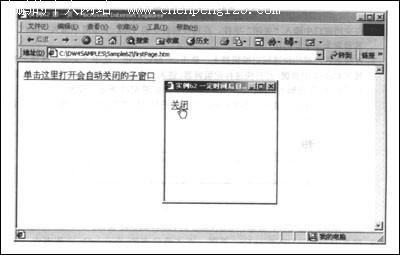 设计页面时,经常会从一个页面打开一个子窗口以供浏览者查看。通常,这种子窗口中的内容一经浏览者看过,对于浏览者而言就不再需要,而他们常常会忘记关掉这些小窗口,致使许多的浏览器窗口打开着,耗用大量的资源。因此我们可以将子窗口设计成经过一段时间后可以自动关闭的形式。 本例中制作了两个页面,如图1所示, Index.html是显示于子窗口中的页面,而在名 为firstpage.html的页面中,包含在子窗口中打开Index.html的链接。单击链接时,将在子窗口中打开index.html。可以直接单击子窗口中的“关闭”链接关闭子窗口,也可以不去理睬它,在15秒之后,子窗口也会自动关闭。