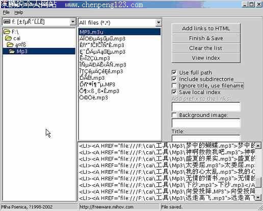 音乐听多了,就想建立自己的音乐网站。将几百首下载的MP3作成音乐网页放在局域网上供全局用户欣赏,建立链接的工作量非常大。可以采用ASP加上音乐数据库的方法解决链接量大的问题。对于许多菜鸟是否还有其它简便的方法实现自己音乐网站的梦想。回答是肯定的。许多网站都有一款索引文件制作工具Mihov Index Maker,几分钟就能自动帮您将所选文件链接到网页上,不信我们试试。