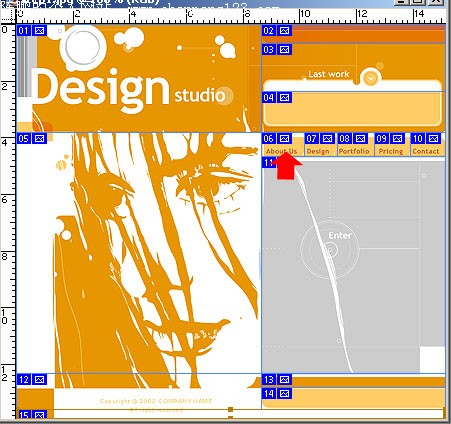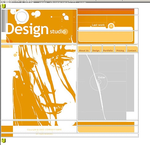 选择工具板上的slice切片工具,先大刀阔斧的切上一番!技巧: 大面积的色块单独切成一块,尽可能的保持在水平线上的整齐(这个问题你们在后面的制作页面中深有感触)切好的图如下所示: