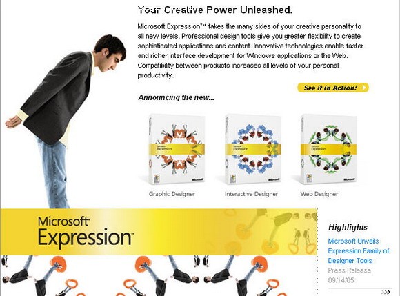 作者:薛欣 www.XueXin.com 自Adobe合并Macromedia后,就不断传来微软开发图形图像和动画软件的消息。不过信息少的可怜,特别是号称Flash杀手的“Sparkle”,除了一条简短的新闻就没别的了。所谓厚积薄发,没想到微软这次一出手就是三款设计软件,看来是要和Adobe动真格的了。 这个设计软件套装名为Microsoft Expression,包括三部分: 开发代号为“Acrylic ”的图形图像处理软件Graphic Designer,相当于Fireworks。 开发代号为“Sparkle”的交互动画软件Interactive Designer,相当于Flash。 开发代号为“Quartz”的网页设计软件Web Designer,相当于Dreamweaver。