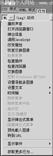 有时在浏览网页时,常常因为网页中的图片文件过大而使下载时间较长,这样还没有下载完,就会有许多浏览者不耐烦地拂袖而去,从而损失了客户流。但要使图片文件变小,可能又要以牺牲图片质量为代价,这样势必使网页吸引力下降,同样不能使网页制作人员满意。 怎样才能做到既有精美的图片,又不使下载时间过长呢?这可以通过调用Dreamweaver 中的Preload Images动作来实现,它可以把尺寸较大的图片预先载入到浏览器的高速缓冲存储器文件中,这可以防止下载图片延时。下面结合实例来介绍给朋友们: 1. 运行Dreamweaver应用程序,并导入一张图片。 2. 选中图片,单击行为标签,在此面板中,点击“增加事件”按钮,出现下拉菜单,如图所示。