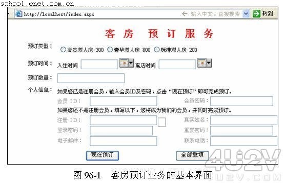 效果说明 图 96-1 所示是预订业务的基本界面,用户可以直接登录或注册并预订客房。