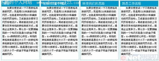 在真正开始工作之前我们脑海中要形成这样一种思想:表格是什么我不知道,在内容部分我不能让它再出现表现控制标签,如:font、color、height、width、align等标签不能再出现,(简单说工作前先洗脑,忘掉以前的一惯做法,去接受和使用全新的方法),我不是单纯的用DIV来实现排版的嵌套,DIV是块级元素,而像P也是块级元素,例如要分出几个文字内容块,不是一定要用DIV才叫DIV排版,不是“<div>文字块一</div><div>文字块二</div><div>文字块三</div>”,而用“<p>文字块一</p><p>文字块二</p><p>文字块三</p>”更合适。