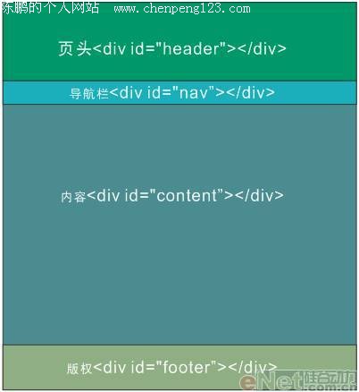 现在我要给大家演示的是一个典型的版面分栏结构,即页头、导航栏、内容、版权(如下图),