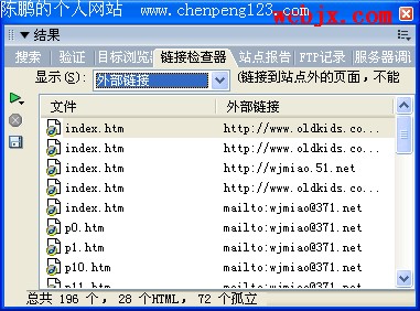 用Dreamweaver8制作好了自己的网站,目的是什么?放到互连网上,也就是最终发布自己的网站,那么自己在制作网页过程中有没有错误呢?所以在发布之前我们要认真的检查一下有没有错误。 在发布网站之前先使用Dreamweaver 8站点管理器对你的网站文件进行检查和整理,这一步很必要。可以找出断掉的链接、错误的代码和未使用的孤立文件等,以便进行纠正和处理。 步骤如下:在编辑视图点击菜单栏的「站点」>选“检查站点范围的链接”,弹出“结果”对话框,如下图: