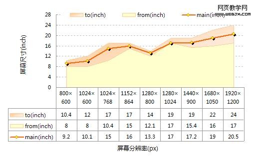 要在物理尺寸和分辨率之间换算,首先要统计分辨率和对应的屏幕尺寸。用户分辨率的分布情况可以从网站的统计日志里获得。由于每个分辨率设置可能对应好几个不同尺寸的屏幕,而屏幕尺寸又无法通过网页获得,只好对现在的显示器市场进行统计分析:针对某一分辨率,统计可能的屏幕尺寸范围,从最小到最大,相对主流的是多大(或使用该范围的中间值作为主流尺寸)。如下图所示——