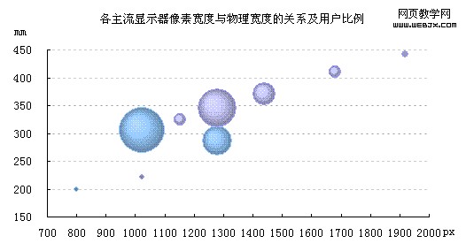 现在的显示器长宽比不仅有4:3的标准屏,16:10的宽屏,还有更多不规则比例,为了在不同长宽比的显示器之间进行比较,统一使用横向分辨率来统计。用主流尺寸和长宽比(假设像素的长和宽相同)计算出屏幕宽度(英寸),再换算成公制(毫米),将其一一对应就可看出屏幕大小的趋势。再结合各分辨率的用户分布,结果如下图所示(图片中每个点对应一个分辨率,横轴为屏幕横向的像素数,纵轴为该屏幕的物理宽度,气泡大小表示使用该分辨率的用户人数。其中蓝色气泡表示标准屏,紫色表示宽屏):最大的三个气泡分别是1024*768,1280*1024,1280*800。
