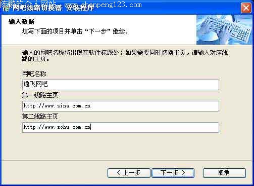 现在很多网络游戏对网络环境有限制,有些只支持网通的游戏,电信用户不能玩,而支持电信的游戏,网通用户不能玩。因此,很多网吧为了解决此问题而分别接入网通和电信等不同的专线。由此一来,新问题又出现了,那就是需要在不同的专线间来回切换。 “网吧线路切换器”这个小工具能很好地解决问题,它能自动帮你在不同线路、网关间切换。 工具档案 软件大小:779KB 下载地址:点击下载 1.软件安装 将软件下载并打开安装向导窗口,按照默认设置单击“下一步”按钮,进入“输入数据”窗口后,在“网吧名称”栏中输入网吧的名称,在“第一线路主页”和“第二线路主页”地址栏中输入你要设置的两条专线的默认主页网址(图1)。