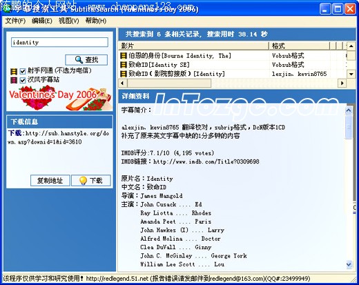 对于大多数的电影爱好者来说,在电脑上欣赏好莱坞大片时绝对少不了字幕。通常我们获得字幕的方法是直接到专业字幕网站搜索下载,小编以来比较懒,二来也觉得这样搜索比较浪费时间。下载歌曲用KuGoo,下载电影用BT,下载字幕当然也要有专业的下载软件。今天给大家带来的就是一款字幕搜索工具——SubtitleSearch。只要你输入电影的关键字,就可以可以在“射手网”和“汉风中文字幕库”网站中搜索需要的字幕而且提供直接下载地址,节省您的时间。 小编比较喜欢看“伯恩的身份”这部片子,正好可以拿它来测试该软件。