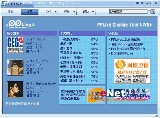 PPMate、PPLive、PPstream是目前互联网上流行的众多网络视频软件中比较受欢迎的软件,这三个软件都以PP开头,它们各自有什么优势、在界面上、功能上、频道上有什么特色?这里笔者带大家一起去寻找答案。 PPLive是最早流行在互联网上的网络视频软件,为众多的网友提供一个看电视节目的一个平台,受到大家的广泛欢迎。PPstream出现的时候网络上这种类似的网络电视软件已经非常多,在激烈的竞争中PPstream仍然像今天这样在互联网上生存和发展,并拥有了一定的名气,也算是取得了不错的成绩。PPMate是最近一个月出现并流行在互联网上的,它凭借其简约的界面、强大的功能和丰富的节目,一发布就立刻受到了大量网友的欢迎,并且升级频繁,功能越做越强,节目越来越丰富,相信很快会取得更大的发展。 下面,笔者将分别从界面和功能上对这三个软件进行横向比较,让大家对这三个软件有一个感性的认识。从而根据个人喜好选择适合自己的软件。 1 界面比较 PPMate的界面选用浅蓝色色调,简单而有不失品味,让人感觉很舒服。在菜单中点击“精简模式”,仅显示播放界面,其他的频道列表区、节目预告区等都隐藏起来。在初始界面上提供了精彩推荐以及十大热点频道排行,点击图片和频道名称就可以进入观看,方便用户查找热点节目。