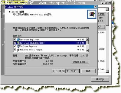 首先是安装IIS,这是微软的支持web服务器的软件,在控制面板,添加删除中选中,点下一步安装,这一点就不用详述了吧,安装的过程中需要2000的安装光盘再菜的网管相信,对软件的安装卸载,对话框,下拉框,滚动条,这些概念还是应该清楚的:)