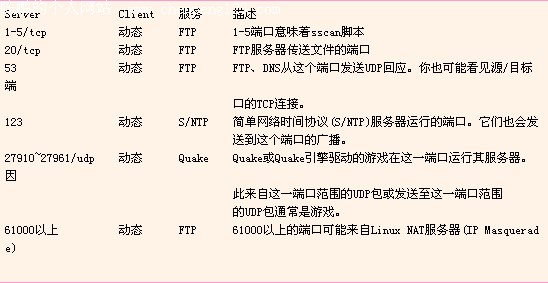 所有穿过防火墙的通讯都是连接的一个部分。一个连接包含一对相互“交谈”的IP地址以及一对与IP地址对应的端口。目标端口通常意味着正被连接的某种服务。当防火墙阻挡(block)某个连接时,它会将目标端口“记录在案”(logfile)。这节将描述这些端口的意义。
