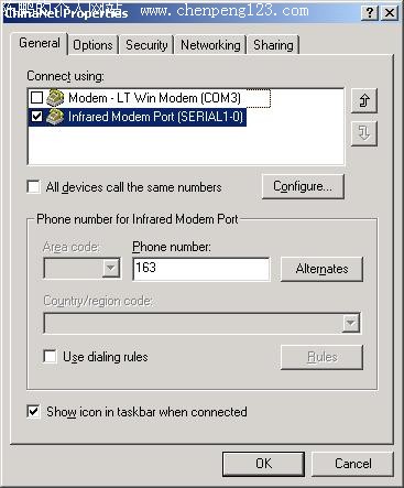 手机上网是许多笔记本用户移动上网的通常方案,而通过红外上网则是最常用的方法了。近年来生产的手机基本上都具备了内置MODEM的功能,用户只需到当地电信营业厅开通数据业务(有的地方是开户时缺省开通数据业务的,则不必再申请,但电信供应商那时一定要有用户的开通数据业务才可以使用),目前只有中国移动通讯有此业务,中国联通则仍然没有开通。开通数据业务之后,笔记本的设置只需几个步骤,马上就可以通过172连接上网,速度目前是9.6K,虽然这个数字有点让人不舒服,但使用起来(信号稳定足够强的前提下)还是算可以应付的,多数情况下都没有想象中那么慢。 Windows2000的设置与XP稍有不同。如果你的手机有红外端口,安装完Windows2000之后,建立拨号网络连接,打开属性,你会发觉Windows2000已经自动为你设置了一个标准的红外端口MODEM了,看图: