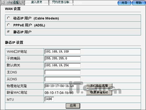 如果WAN口接出设备是动态分配IP,那应该选择动态IP用户,不过这种情况很少遇到,一般家庭都是才用PPPoE模式或者是静态IP的模式。要用到无线路由器拨号的用户,应该选择PPPoE模式,相应填入相应的ADSL用户名和用户密码。如果是固定IP接入到WAN口,则采用静态IP用户摸索,如果下图。