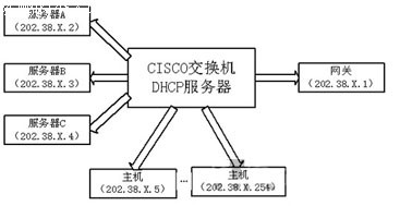 什么是DHCP服务器呢?为什么我们要配置DHCP服务器呢? 所谓的DHCP就是Dynamic Host Configuration Protocol的缩写,即动态主机配置协议,它是TCP/IP协议簇中的一种,主要作用给网络中其他电脑动态分配IP地址之用。 纯粹地谈DHCP协议也许大家会觉得很陌生,但是说到“自动获取IP地址”,各位有装机经验的朋友可能就比较熟悉了。在windows 2000下,我们打开“本地连接 属性”对话框之后,双击“internet 协议 (TCP/IP)”,打开“internet 协议 (TCP/IP) 属性”对话框中,就有一项“自动获得 IP 地址”(当然我们也可以直接指定固定IP给电脑)。然而为什么我们可以使电脑来自动获取IP呢?试想一下,如果每台电脑可以自动获取任意IP的话,那岂不是IP地址严重冲突,网络世界大乱。然而现实生活中使用自动获取IP的网络并没有象我们想象中的一片混乱,为什么呢?原因就是在我们的网络中存在这一个DHCP服务器,这个DHCP服务器管理着网络中的IP地址资源,使得各IP地址合理地分配给网络中的每一台有需要的主机。 为什么我们有时候需要DHCP服务器来使IP自动分配呢?举个例子来说明一下:假如在某单位中有400台电脑,但是在任何一个时刻,要上网的电脑不会超过255台。如果使用固定IP的话,那么我们就需要为这个单位申请400个IP才够用;但是如果我们使用动态IP分配的话,我们只要申请255个IP就已经足够了,节省了145个IP资源的费用。DHCP服务就是特别试用于这种IP资源使用密度不高的情况。 然而,常规的方法来讲,需要专门配置一台服务器来做DHCP服务器,这样无疑又增加了网络耗费。据笔者的经验,有时在一些网络低层设备中(如路由器、交换机等)里面整合了DHCP服务,一般的小型网络里,我们完全可以利用网络中的这些网络设备是上的DHCP服务来配置我们自己的DHCP服务器,而不需要另外专门配置一台服务器来做DHCP服务。 下面我就以cisco交换机(其他款交换机没试过)为例子,说说具体做法: 假设在某网络中有400台主机,其中申请了255个以供分配的IP,其范围从202.38.X.0~202.38.X.254,其中202.38.X.1是用来分配给网关的,该网络里有三台服务器A、B、C,其需要固定的IP,分别为202.38.X.2、202.38.X.3、202.38.X.4,其他的所有IP均供动态分配之用。网络拓扑结构如下: