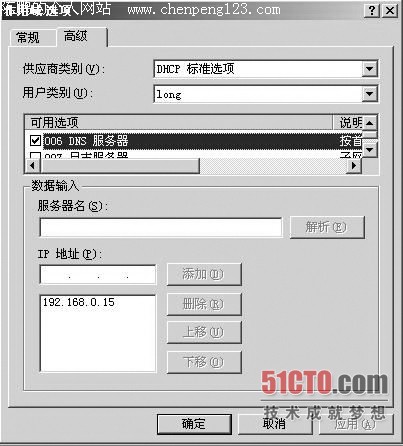 右击“作用域选项”,选择“高级”,在下面的“用户类别”中选择刚才创建的用户类别“Long”,然后在下面的可用选项中选择需要配置的选项,一般我们选择“003路由器”和“006 DNS服务器”,以及“051 租约”等选项。DNS的设置选择“006 DNS服务器”,在下面的IP地址输入本地DNS服务器地址,按“添加”就可以了(如图1)。