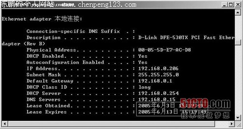 | 例如,要对一个称之为“局域网连接”的网卡配置用户类ID为“myuserclass”的DHCP类,只需要在命令行中输入ipconfig /setclassid “Local Area Connection” myuserclass,然后按下回车即可。在客户端只有一块网卡,所以这里也可以这样写 “ipconfig /setclassid * long”,星号代表本地所有连接,这样客户端就会使用ID为Long的DHCP用户类。图2为已配置好的Windows 2000系统客户端的本地网络参数。 从图4中我们可以看到,租约为10天,就是我们刚才配置的租期。DHCP Class ID 为long,DNS Servers和DHCP Servers还有网关皆为先前所设定值。大功告成啦!