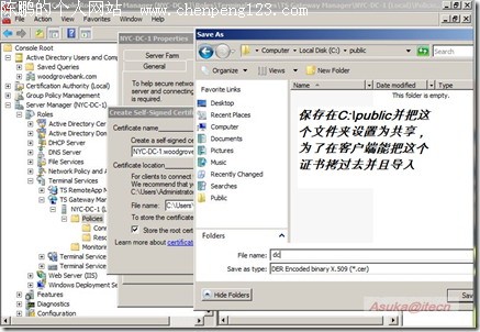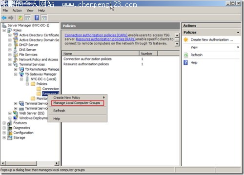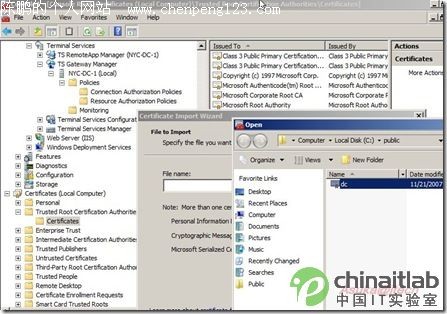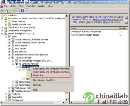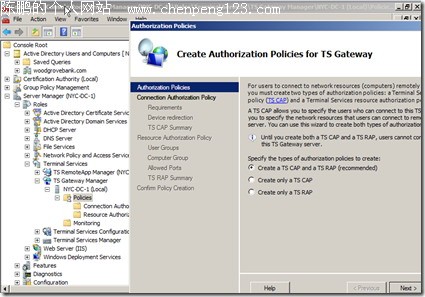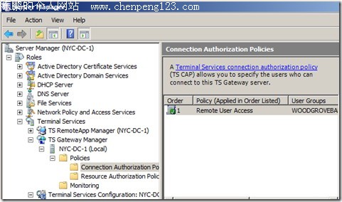 2008的终端有2大特性:TS Gateway和TS Remote APP(包括Web Access),这篇文章介绍前者。由于这是我第一次写这种Step by step的文章(平时这类文章看得不少,写得太少),因此在文章内容的尺寸把握上肯定会有不准,还望指教。也希望我在技术方面能变得勤劳一些所以,多写些雄文,也多向conan、kejia等诸位兄弟们学习。如果文章里面有任何的问题不清楚,欢迎讨论。 实验环境: DC:192.168.1.3------Win 2008 DC/TS Gateway Server/Terminal Server NY:192.168.1.2------Win Vista Client 1.添加角色:Terminal Service和IIS(IIS是为了做Web Access用的,这里并没有用到)