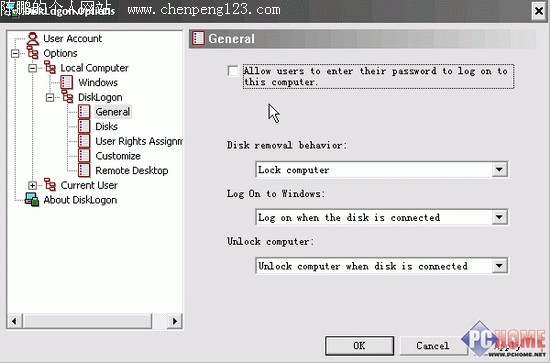 U盘如今可以说非常普及了,不过,如果只是把它用来存储数据的话,也许有点可惜了。其实,我们还可以让U盘发挥更大的能量!例如,今天小编教你一招,能让你的U盘瞬间变为电脑密钥盘。之后,当你插上U盘就能正常进入系统操作,而一旦拔出U盘,将即可锁定电脑,任何操作都无法进入系统。怎么样,是不是很有兴趣一试?那么这就跟着小编一起看完本文吧!要想成功实现上述功能,我们需要借助名为Disklogon的小工具,并加以正确设置即可。 顺利安装完Disklogon之后,需要先对软件进行一番设置才能发挥作用。直接开始菜单中单击“Disklogon Options”进入设置界面,并依次执行“Options/Disklogon”操作。 Step1:首先进入“General”对如下参数进行设置(图1) 1)“Disk removal behavior”:设为“Lock computer”,即实现拔下U盘时自动锁定电脑的功能。 2)“Log on to Windows”:选择“Log on when disk is connecte”,功能是当U盘插入时自动登陆系统。 3)“Unlock computer”:“Unlock computer when the disk is connected”,主要作用就是当U盘正确插入之后,解除对系统的锁定。 4)取消“Allow Users to type their username and password to log on or unlock computer”的复选项,这样Disklogon将只实现使用U盘来登录或解锁系统了,其他一些功能将不再奏效。