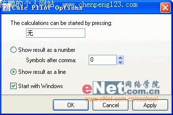 双击图标,或在图标上点击右键,选择“Options”(设置),弹出“Calc Pilot Options”对话框(如图1),在“The calculations can be started by pressing”(按键以开始计算)下方,按下一个键或组合键,这样一来,当输入公式后,按下这个键,计算结果就可以显示出来。