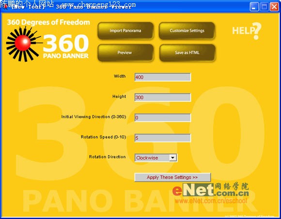 第二步:点击“Customize Settings”(个性化设置),对全景图的宽度、高度、旋转速度进行设置(如图2)。设置完成后点击“Apply These Settings”(接受这些设置)以保存设置。