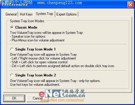点击“System Tray”(系统托盘)选项卡(如图6),共有三种系统托盘图标显示方式可以供我们选择,分别是“Classic Mode”(原始设置),“Single Tray Icon Mode1”(一个系统托盘按钮方式1)和“Single Tray Icon Mode2” (一个系统托盘按钮方式2),原始设置就是在系统托盘上显示两个图标,而一个系统托盘按钮方式选项是指只在系统托盘上显示一个图标,在这个图标上点击鼠标左键和右键仍然控制音量,而如要打开音量控制对话框则使用其它快捷键。