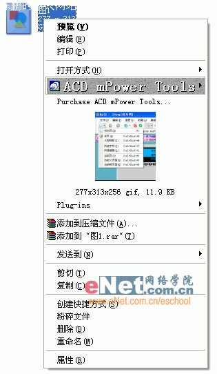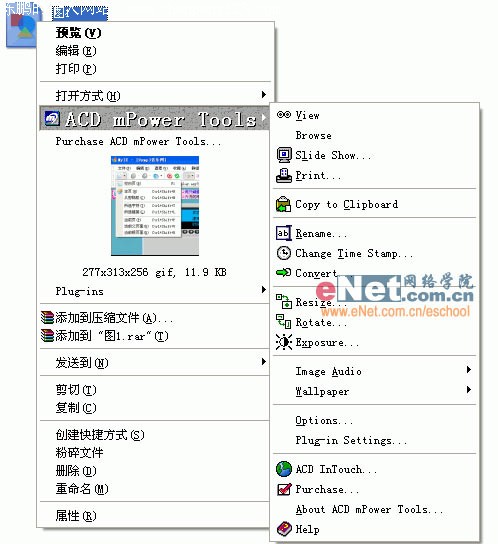 使用过ACDSee的朋友都知道,在ACDSee高级一点的版本中,在图片文件上点击右键,弹出的快捷菜单中,就会出现这个图片的缩略图,这样一来,我们就可以快速预览图片了,而如果不安装ACDSee,是否也可以实现在右键菜单中图片缩略图的预览呢?答案是肯定的,使用ACD公司出品的ACD mPower Tools这个小工具,就可以实现在图片文件上点击右键弹出菜单中图片文件的预览。下面我来介绍一下这款软件的使用方法。