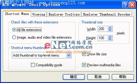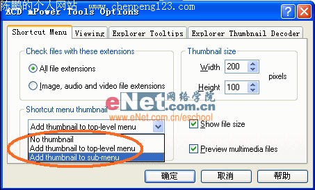 这个软件的默认设置是在系统启动时自动运行,会在系统托盘上出现一个图标,在上面点击右键,选择“ACD mPower Tools Options”,弹出ACD mPower Tools Options对话框(如图4),在“Shortcut Menu”(快捷菜单)选项卡中,我们可以对缩略图出现的位置进行设置,在“Shortcut menu thumbnail”(快捷菜单缩略图)下方我,有三个选项可供我们进行选择(如图5),从上至下分别是不显示缩略图;在快捷主菜单显示缩略图;在快捷子菜单中显示缩略图。