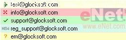 在“Enter e—mail address(one only) ”(输入一个电子邮箱地址)下方的文本框中输入一个电子邮箱地址,然后点击“Add”按钮,再点击上方的 “Start Verifying”(开始检验)按钮开始对这个电子邮箱地址进行检测,共有四种可能的检测结果,从上方到下方(不包含最上方正在检测中的项),分别是不可用;可用;未被检测;网络超时四种结果(如图2)。