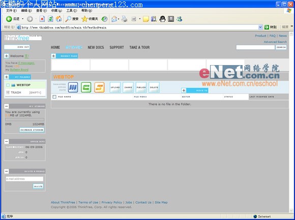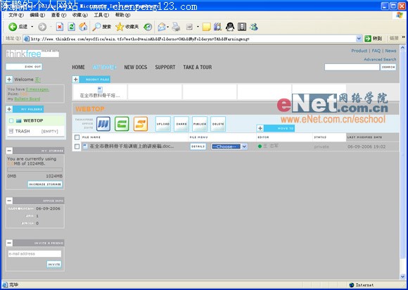 好了,现在我们可以看到(图2)所示的在线办公页面,“WEBTOP”下面有三个按钮:Create New Document、Create New Pressentation、Create New Spreadsheet,分别可以用来新建*.doc、*.xls、*.ppt格式的文档,右侧一排按钮则可以完成上传文件、文件共享、发布、删除等相应的操作。每个注册用户可以获得1024MB的存储空间,相信保存Office文档应该是足足有余的了。