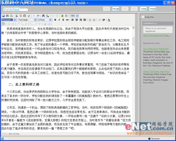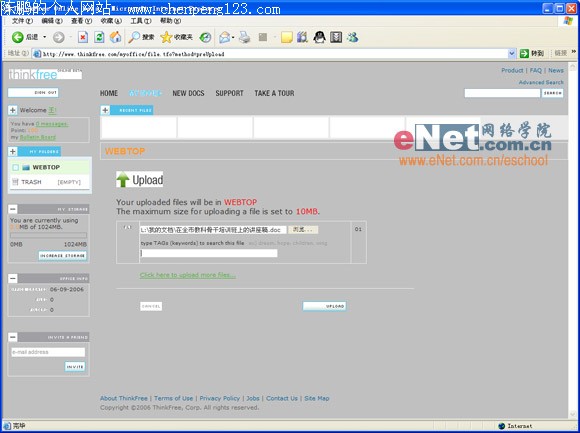 小王首先将邮箱中的讲话稿下载到本地,然后单击“UPLOAD”按钮上传到ThinkFree(见图3),需要提醒的是,上传的文档最大不能超过10MB。另外,除了处理*.doc文档外,ThinkFree还同时提供了对*.xls、*.ppt格式的支持,只要单击“Click here to upload more files…”按钮就可以同时上传多个文档。