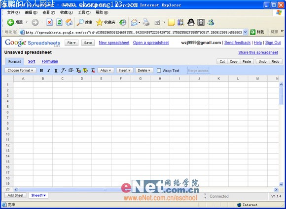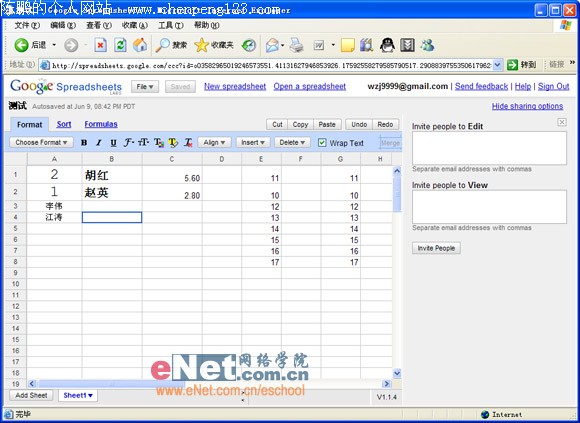 访问http://www.google.com/googlespreadsheets/try_out.html进行登录,得到Google的邀请后即可进入(图8)所示页面,这个Web Excel的页面看起来真的是很不错,虽然是英文界面,但如果你有Excel的基础,看起来应该不会感到陌生,我们熟悉的菜单栏、工具栏一应俱全,口顶部提供了“File”菜单栏,右侧则是Save、New spreadsheet、Open a spreadsheet等相关按钮,当然与真正的Excel还是有一些区别的。